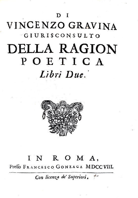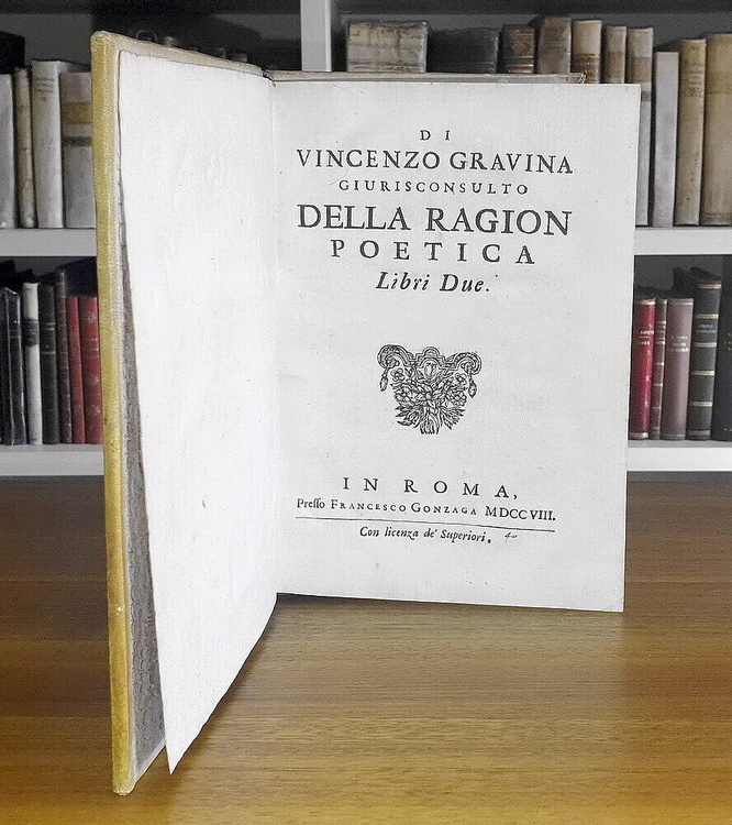 Cm. 21,5, pp. (8) 215 (1). Ottima legatura strettamente coeva in piena pergamena rigida con titoli in oro al dorso. Bella carta marmorizzata a contropiatti e sguardie; segnacolo in seta verde. Sporadiche e trascurabili fioriture, peraltro esemplare fresco e ben conservato. Gian Vincenzo Gravina (1664-1718), celebre giurista e letterato calabrese, fu uno dei fondatori dell'Arcadia. In quest'opera tentò di costruire su principi razionalistici una nuova estetica, basata sul concetto di verosimile come fondamento della creazione artistica; Gravina nel saggio tentò anche di delineare un tentativo di storia letteraria italiana. Rara prima edizione. Cfr. Iccu; Biancardi-Francese, prime edizioni italiane, p. 233.