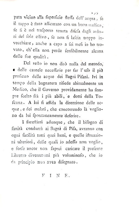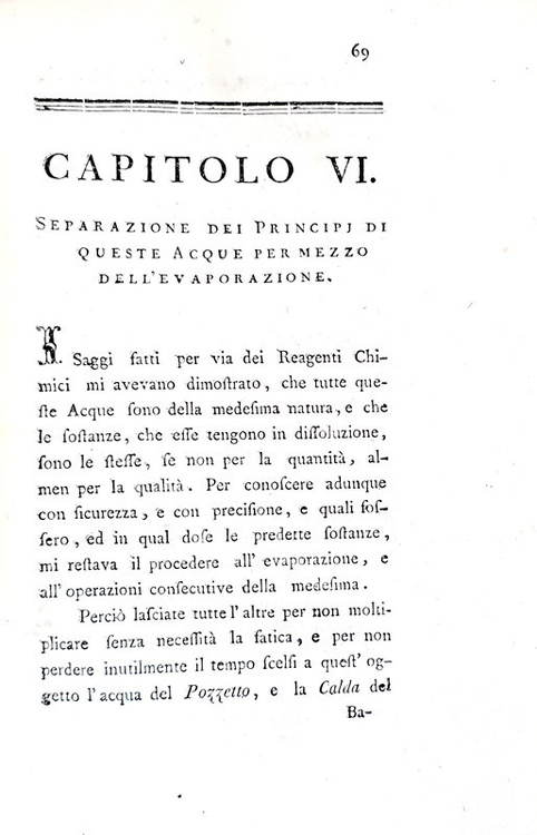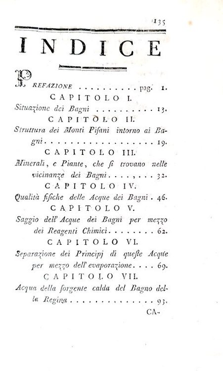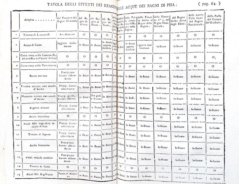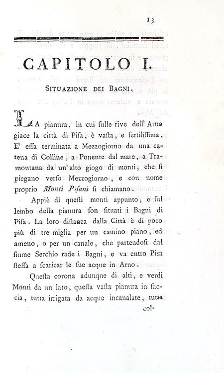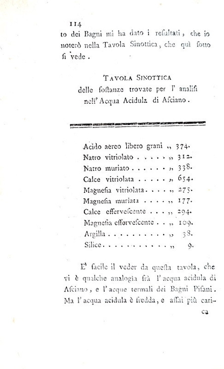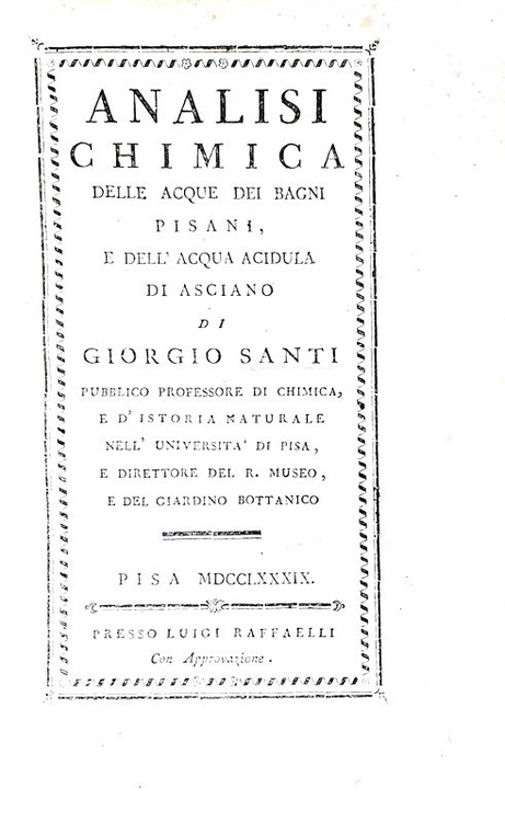 Analisi chimica delle acque dei bagni pisani, e dell'acqua acidula di Asciano. Pisa, presso Luigi Raffaelli, 1789.