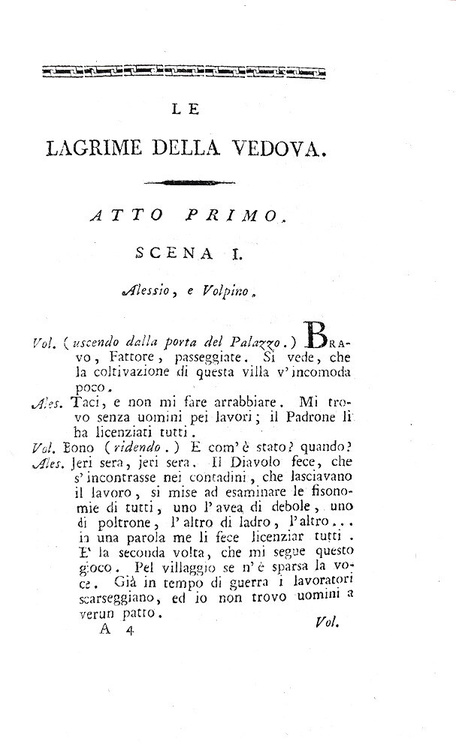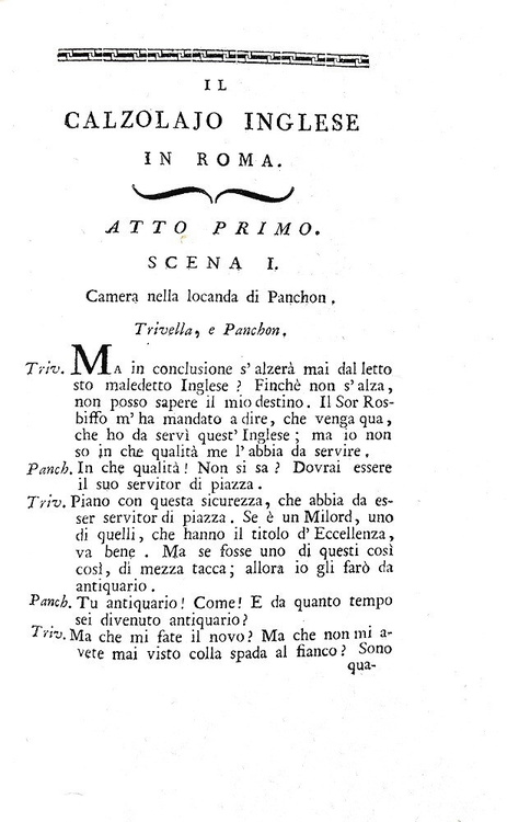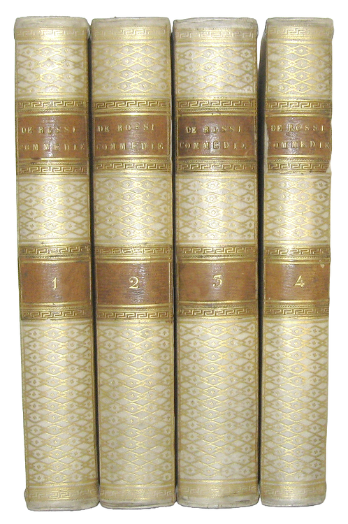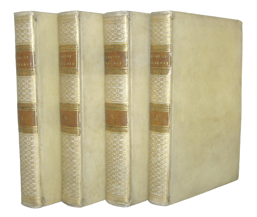 Quattro volumi di cm. 19,5, pp. (2) xx, 306 + 1 c.b.; (2) 351 (1); (2) 359 (1); (2) 276. Con bellissimi frontespizi figurati incisi finemente in rame. Splendida legatura strettamente coeva in piena pergamena rigida con titoli su doppio tassello e ricche decorazioni in oro al dorso; tagli spruzzati e segnacoli in seta. Esemplare di non comune freschezza e ottimamente conservato. Giovanni Gherardo De Rossi (1754-1827), commediografo ed erudito romano, fu anche ministro delle Finanze sotto la Repubblica Romana (1798-90). Le sue 16 commedie, connotate da vivacità e spirito satirico fuori dal comune, gli garantirono indubbia fama. Tomo I: Il secondo giorno di matrimonio; Il cortigiano onesto, ovvero i cambiamenti di un giorno; Il calzolajo inglese in Roma; La famiglia dell'uomo indolente. Tomo II: Le sorelle rivali; L'astratto geloso; Il maestro di cappella; La commedia in villeggiatura. Tomo III: Il podestà di Bisenzio; La prima sera dell'opera; Le conseguenze di una imprudente risoluzione; Il presuntuoso. Tomo IV: Le lagrime della vedova; L'officio della posta; Il soverchiatore; La bottega del caffè nel festino. Rara prima edizione. Cfr. Iccu; Graesse, VI, 169; Brunet, IV, 1407, menziona solo numerose edizioni stampate agli inizi dell'Ottocento.