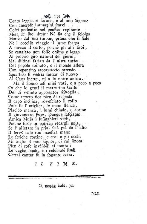 Cm. 20, pp. 120. Legatura strettamente coeva in cartonato alla rustica con nervi passanti e titoli manoscritti al dorso. Ex libris novecentesco al contropiatto anteriore. Esemplare ottimamente conservato, fresco e a pieni margini diseguali. Il Giorno è un componimento del poeta Giuseppe Parini scritto in endecasillabi sciolti, che mira a rappresentare in modo satirico, attraverso l'ironia antifrastica, l'aristocrazia decaduta di quel tempo. Con esso inizia di fatto il tempo della letteratura civile italiana. Il poemetto è diviso in tre parti: Mattino (ed. 1763), Mezzogiorno (ed. 1765) e Sera, divisa in due parti (il Vespro e la Notte ) stampate postume soltanto nel 1801. Visto il successo dei primi due poemetti pubblicati a Milano nel 1763 e nel 1765 il veronese Mutinelli approfittò del momento per pubblicare nel 1766 il suo poemetto "La Sera", che fu poi disinvoltamente aggiunto dagli editori a quelli del Parini in molte edizioni successive come la nostra Savioni. Cfr. Iccu; Bustico, nr. 41.