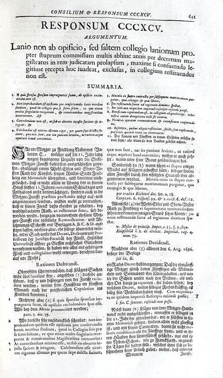 Responsa et consilia cum deductionibus nonnullis tam proprio quam facultatis juridicae nomine elaborata variorum casuum et controversiarum enucleationes ex jure civili, publico, feudali, canonico et criminali continentia. Francofurti ad Moenum, apud Joh. Benj. Andreae et Henr. Hort., 1729.