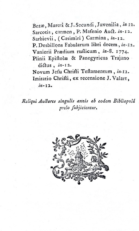 Carmina [et Satyrarum, Epistolae, De arte poetica, Epodon, Carmen saeculare] detersis recentibus plerumque maculis, nitori suo restituta. Nova editio. Parisiis, typis J. Barbou, via Mathurinensium, 1775.