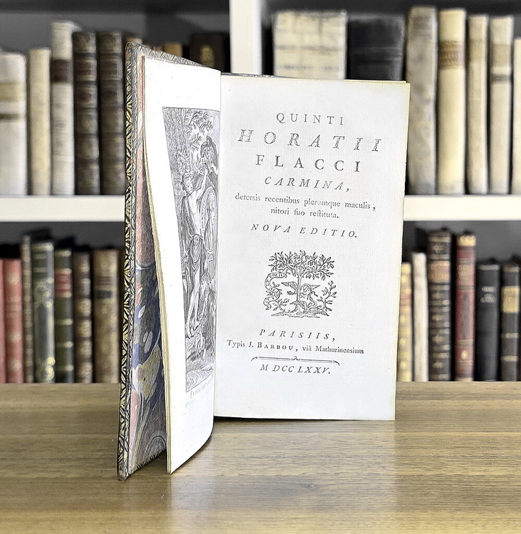 Cm. 15,5, pp. 356 (2) + 1 carta bianca. Con una bellissima antiporta allegorica incisa in rame raffigurante l'Autore entro medaglione circolare. Bel marchio tipografico di impronta elzeviriana e numerose testatine xilografiche (due incise finemente in rame, relativa a Odi e Satire). Splendida legatura coeva in piena pelle con titoli su tassello in pelle e ricchi fregi in oro al dorso; piatti inquadrati da triplice filetto e tagli dorati. Segnacolo in seta e sguardie in bella carta policroma. Piccola mancanza alla cuffia superiore, lieve alone limitato al margine bianco di alcune carte. Esemplare nel complesso ben conservato. Elegante e accurata edizione Barbou delle opere di Orazio (65 a.C. – 8 a.C.). Le Odi (Carmina) di Orazio sono costituite da 103 poesie composte dal grande poeta nativo di Venosa a partire dal 30 a.C. Il modello della raccolta è la grande poesia greca di età arcaica, soprattutto Alceo, Anacreonte, Saffo, Pindaro e i poeti dell'isola di Lesbo, con la ripresa di diversi tipi di componimento e di metri vari. Seguono le seguenti opere: a p. 153 Epodon liber, a p. 185 Satyrarum, a p. 263 Epistolarum, a p. 324 De arte poetica, a p. 341 Carmen saeculare Cfr. Iccu; Brunet, III, 321; non in Graesse.