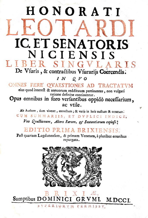 Usura e prestiti: Leotardus - Liber singularis de usuris et contractibus usurariis - Brixiae 1701