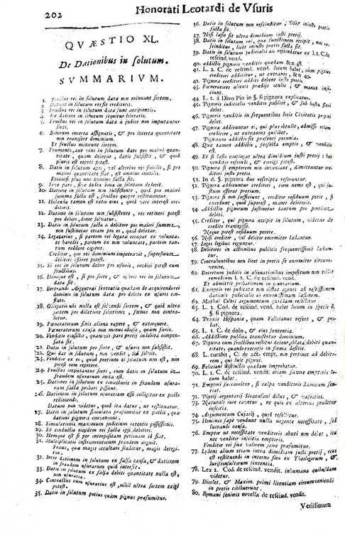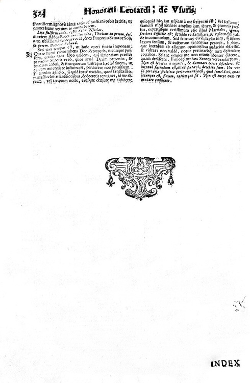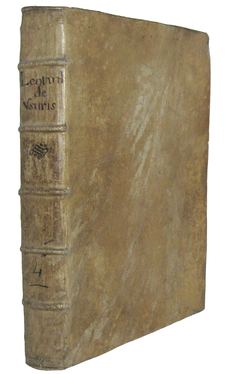 Cm. 34, pp. (12) 574 (62). Frontespizio in rosso e nero con bella vignetta, graziose testatine enumerosi capilettera xilografici. Legatura strettamente coeva in piena pergamena rigida, dorso a 5 nervi con titoli manoscritti. Trascurabili forellini al dorso e al margine interno delle carte finali, sporadici e lievi aloni perlopiù marginali. Esemplare nel complesso genuino e in buono stato di conservazione. Onorato Leotardo (?-1650 ca.), consigliere a Nizza, fu giureconsulto di notevole fama attivo nella prima metà del XVII secolo. L'Autore raccoglie 100 quaestiones sopra il tema dell'usura e proprio il carattere monografico in relazione ad un argomento così rilevante nella storia del pensiero giuspolitico attribuisce pregio aggiuntivo all'opera. Rara e pregevole edizione bresciana di uno tra più significativi trattati dedicati monograficamente al fondamentale tema dell'usura. Cfr. Iccu; Sapori, 1645; Cat. Einaudi, 3321, per un'altra edizione.