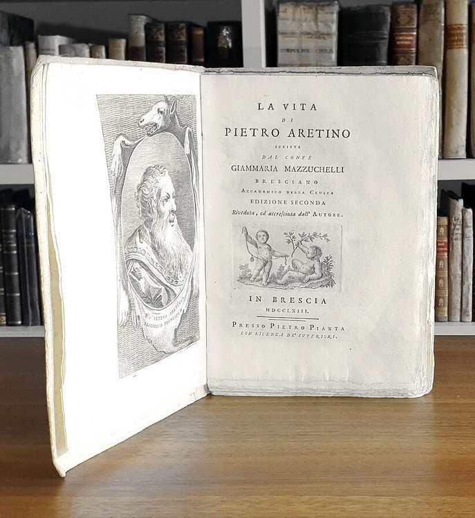 Cm. 19, pp. xxxii, 329 (1). Con un bel ritratto dell'Autore in antiporta (inciso all'acquaforte da Giuseppe Patrini) e sette tavole fuori testo incise finemente in rame (raffiguranti medaglie realizzate ai tempi dell'Aretino con immagini sue e di persone a lui vicine). Vignetta al frontespizio, e alcune iniziali e fregi xilografici nel testo. Bella legatura coeva in cartonato alla rustica con nervi passanti e titoli manoscritti al dorso. Ottimo esemplare a pieni margini diseguali. Gianmaria Mazzucchelli (1707-1765) è stato uno dei principali studiosi di letteratura italiana del Settecento. La "Vita di Pietro Aretino" fu pubblicata per la prima volta a Padova nel 1741 dal Comino con prefazione di Seghezzi. In questa elegante seconda edizione il testo compare rivisto e accresciuto dall'Autore, sempre preceduto dalla prefazione di Seghezzi, ma con l'aggiunta di un nuovo discorso introduttivo di Giambattista Chiaramonti. Questa biografia offre ancora oggi un quadro vivo e apprezzabile della vita di Pietro Aretino, flagello dei principi (ma in realtà molto attento a procacciarsene i favori) e degli ambienti sociali e culturali della prima metà del Cinquecento. Edizione molto appreaazata anche per il raffinato apparato iconografico. Cfr. Iccu; Gamba, 2349 "Il Zeno ch'ebbe a leggere la prima edizione di Padova scrisse che nel suo genere e per ogni verso è opera eccellente ed originale".