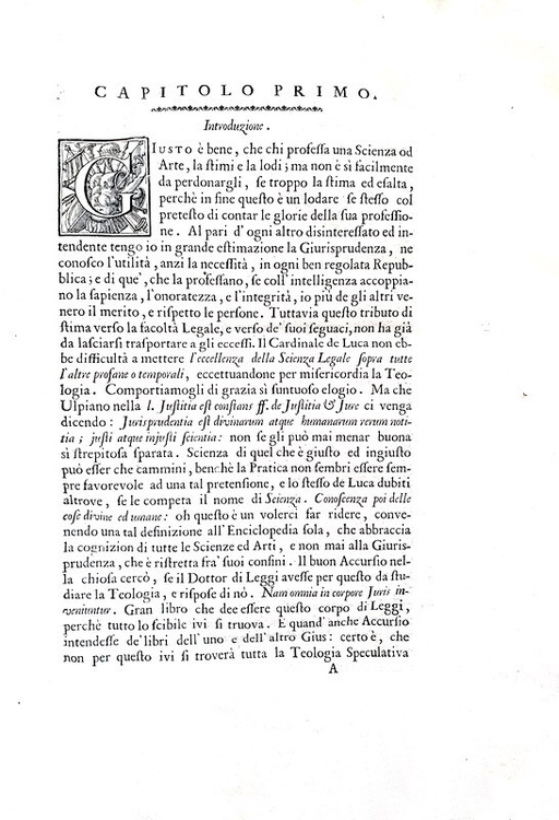 Cm. 35,5, pp. (8) 184 + 1 carta bianca. Bella vignetta xilografica al frontespizio in rosso e nero. Legatura strettamente coeva in cartonato alla rustica con nervi passanti. Trascurabile strappetto, senza alcuna mancanza di carta, al margine esterno del frontespizio. Segni del tempo (piccoli strappetti al dorso e imperfezioni alle estremità dei piatti) limitati alla legatura, peraltro esemplare internamente freschissimo e ben conservato, ad ampi margini, caratterizzato da carte candide e prive di fioriture/aloni. Ludovico Antonio Muratori (1672-1750), nativo di Vignola (Mo), fu personaggio di primo piano nella costellazione dell'intellettualità settecentesca italiana e profuse il suo impegno in quasi tutti i campi della conoscenza. Viene ad oggi considerato autorevole esponente dell'illuminismo moderato e cattolico, nonché il padre della storiografia italiana. Questo vero e proprio capolavoro influenzò in modo determinante la dottrina giuridica italiana del Settecento e soprattutto i nascenti processi di codificazione (es. codice estense e codice toscano). L'intento dell'Autore consiste nel cercare di rendere evidente l'esigenza di reductio ad unum, quindi di codici che ponessero un ordine sistematico alle numerose fonti di diritto vigenti. Il trattato spazia dall'indagine sopra i concetti di giustizia, legge, giurisprudenza e legislazione, a temi strettamente tecnici come prescrizione, usucapione, fideicommissi e sostituzioni. Rarissima e ricercata prima edizione (la seconda edizione fu stampata nel 1743 presso i medemimi torchi ma in piccolo formato come tutte le successive). Così Sorbelli (Bibliografia muratoriana I, 154): «In questo libro il M. tratta metodicamente della giurisprudenza come pratica civile e passa in rassegna i vizi che la deturpano, consigliando infine nuove codificazioni». Cfr. Iccu; Edizioni giuridiche antiche in lingua italiana, II,1, p. 355.