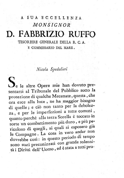 Cm. 25, pp. viii, 448. Con un bel ritratto dell'Autore inciso finemente in rame all'antiporta. Bella legatura strettamente coeva in piena pergamena rigida con titoli in oro su tassello in marocchino rosso al dorso. Lievi e sporadiche fioriture. Esemplare nel complesso fresco ben conservato. Ricercata prima edizione dell'opera principale del filosofo e pensatore politico catanese Nicola Spedalieri (1740-1795). Vi si asserisce il fondamento cristiano dei principi scaturiti dalla rivoluzione francese e si individua nella sovranità popolare il cardine del governo politico. Le posizioni filo-giacobine espresse nell'opera valsero all'Autore la riprovazione di gran parte dell'universo dottrinale cattolico. Cfr. Edizioni giuridiche antiche in lingua italiana, II, 3, p. 1148; Mira, II, 381; non in Sapori.