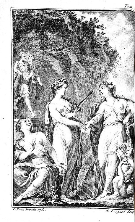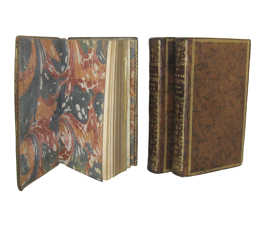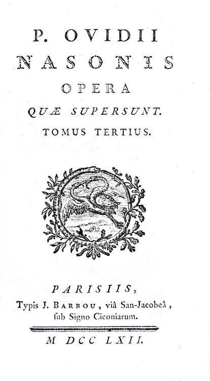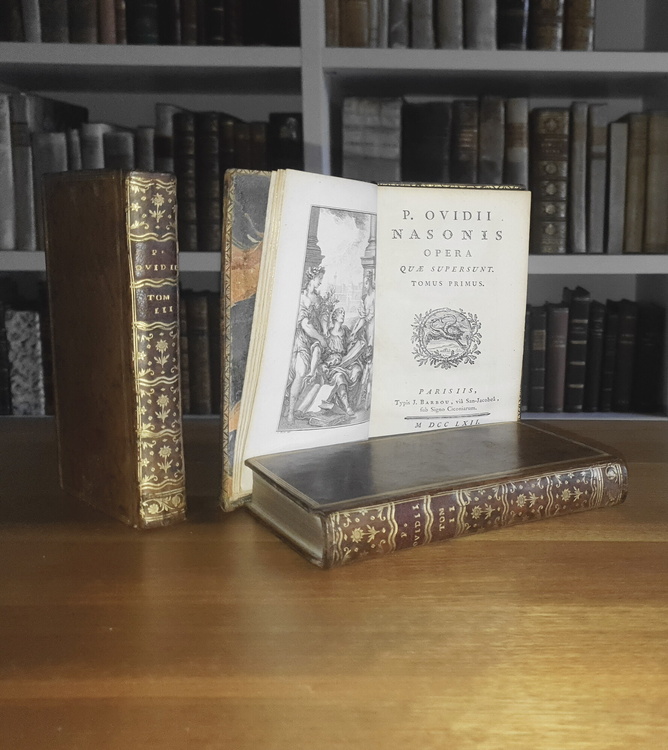 Tre volumi di cm. 15,5, pp. (4) xii, 328; (4) 376 (8); 396. Tre bellissime antiporte f.t. incise finemente in rame (disegni di Eisen, incisioni di Longueil), numerose testatine (perlopiù xilografiche, alcune in rame). Splendida legatura strettamente coeva in piena pelle con titoli in oro su doppio tassello rosso e ricchi fregi in oro al dorso; tagli dorati, piatti inquadrati da triplice filetto e dentelles dorate. Segnacolo in seta verde e sguardie in bella carta policroma. Trascurabili segni del tempo alle legature e sporadiche macchiette/arrossature, peraltro esemplare nel complesso fresco e ben conservato. Elegante e raffinata edizione parigina dell'opera di Ovidio (43 a.C. – 17/18 d.C.): Heroides, Amorum, De arte amandi, Remediorum amoris, Medicamina Faciei fragmentum, Consolatio ad Liviam Augustam, Metamorphoseon, Fastorum, Tristium, Epistolarum ex Ponto, Ibis, Fragmenta. Edizione poco comune e ricercata. Cfr. Brunet, IV, 273; Cohen-Ricci, II, 774; Iccu; Kvk.