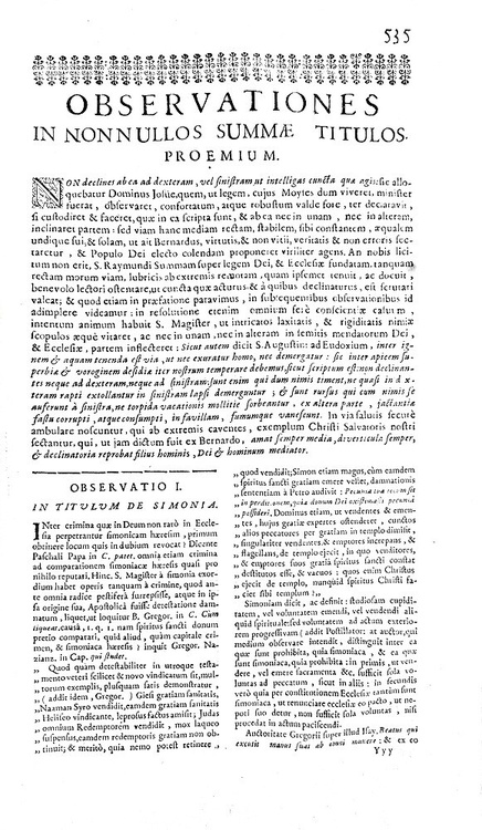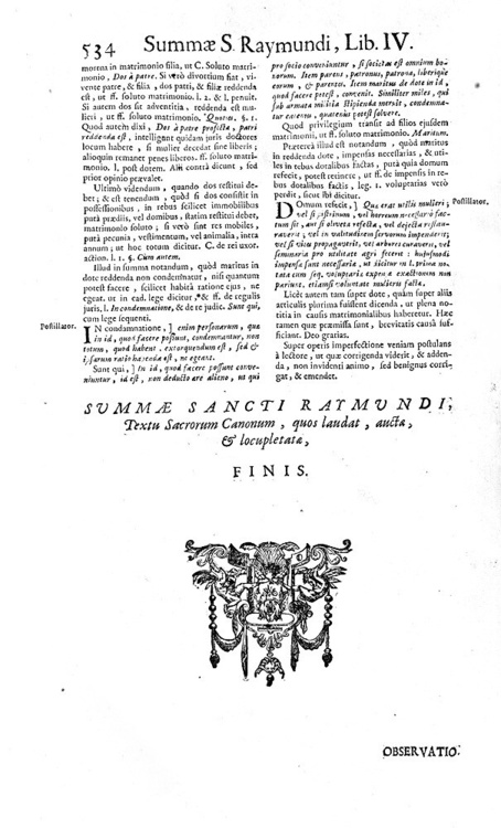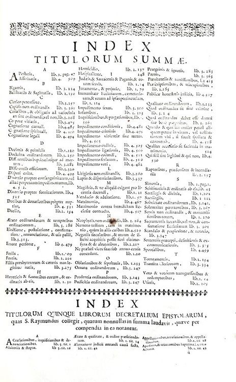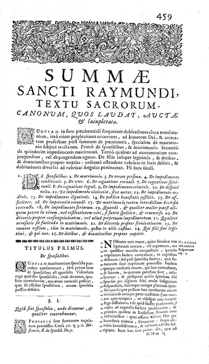 Cm. 36,5, pp. (36) 574 [recte 576], (56), 8. Legatura strettamente coeva in piena pelle, dorso a 6 nervi con titoli in oro su tassello, tagli spruzzati. Antica firma di possesso al frontespizio. Minime tracce d'uso alla legatura con una piccola mancanza alla parte alta del dorso. Trascurabili/sporadiche macchiette. Esemplare nel complesso fresco e ben conservato. Raimondo di Penyafort (1175-1275), domenicano originario della Catalogna, fu filosofo e canonista di straordinaria caratura scientifica. Insegnò diritto a Bologna e fu autore, su commissione di Gregorio IX, delle celebri Decretales e quindi di numerose summae poi raccolte in questa celeberrima Summa de casibus. Trattazioni monografiche sono dedicate ai seguenti argomenti: simonia, eresia, questione ebraica, adulazione, giuramento, tipologie di sortilegi (sentenze e pene), matrimonio (condizioni, impedimenti, mutuo consenso, violenza carnale, bigamia, dispensa minori, clandestinità, divorzio), omicidio e furti (pene, casi di guerre o naufragi), usura (definizione e tipologie di usura), contratti, privilegi ecclesistici, sentenze, penitenza, duello, sacrilegi (casistica ed immunità), sepoltura (scomunicati, eretici, morti in duello, pellegrini), ecc. Rara e importante edizione lionese di questo capolavoro della scienza giuridica tardo-medievale. Cfr. Iccu; non in Sapori.