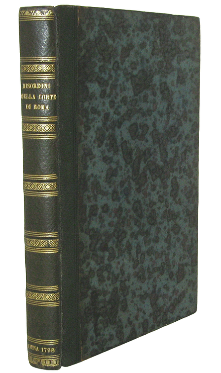 Cm. 21, pp. (2) 328. Bella legatura del tempo in mezza pelle verde; dorso a 5 nervi con titoli e ricchi fregi in oro; carta marmorizzata ai piatti e sguardie in bella carta policroma dell'epoca. Trascurabili e sporadiche fioriture. Esemplare nel complesso fresco e ben conservato. Girolamo Giuseppe Vincenzo Spanzotti (Torino 1741-1812), di formazione giuridica, si dedicò alla vitas ecclesiastica e politica sposando posizioni gianseniste. Dal 1790 fu idealmente vicino alle istanze della Rivoluzione francese e Nel 1794, per ordine del primo segretario degli Interni, conte Pietro Giuseppe Graneri, fu arrestato poco prima della scoperta della congiura repubblicana torinese. Spanzotti prese parte attiva alla vita politica torinese dopo la fuga di Carlo Emanuele IV e l'instaurazione del governo repubblicano il 9 dicembre 1798. “Agli anni a cavallo tra i due secoli si datano le opere principali di Spanzotti, i Disordini morali e politici della corte di Roma, apparsi in una prima edizione anonima a Siena presso Luigi e Benedetto Bindi nel 1798 […]. Nei Disordini, influenzati da Adalberto Radicati di Passerano e Febronio, Spanzotti criticava il potere temporale della Chiesa e la pretesa di infallibilità del papa a tutto vantaggio del potere dei vescovi; rimproverava inoltre gli abusi nell'uso della censura libraria, della scomunica e dell'inquisizione, per chiedere infine la convocazione di un concilio generale per la riforma della Chiesa. Il modello additato, in un'ottica esplicitamente anticoncordataria, era quello della costituzione civile del clero; Spanzotti propugnava in particolare l'elezione dei pastori e il controllo delle autorità politiche sulla disciplina della Chiesa” (cfr. voce S. curata da Glauco Schettini in Dizionario Biografico degli Italiani, volume 93, 2018). i Disordini furono riediti a Torino nel 1852, nel clima di anticlericalismo che fece seguito al fallimento della prima guerra di indipendenza e all'approvazione delle leggi Siccardi. Rarissima prima edizione. Cfr. Iccu; non censito in Bibliografia delle edizioni giuridiche antiche in lingua italiana.