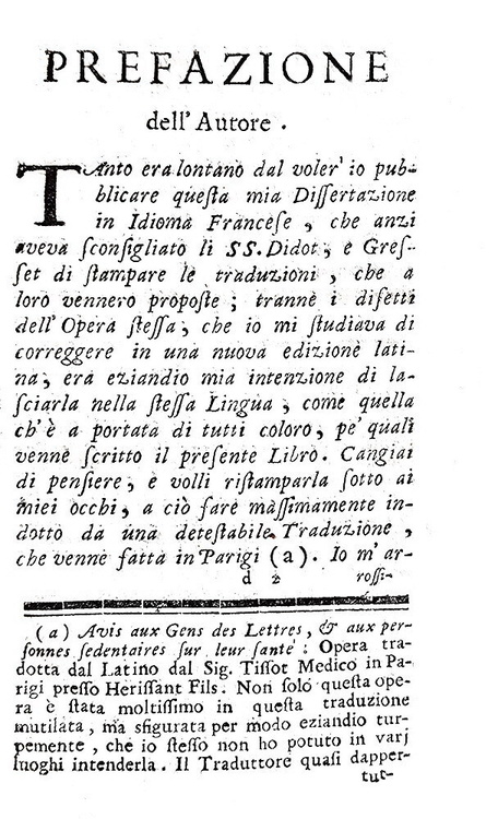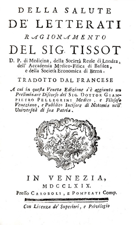 Della salute de' letterati ragionamento del sig. Tissot ... Tradotto dal francese a cui in questa veneta edizione s'è aggiunto un preliminare discorso del sig. dottor Giampietro Pellegrini. In Venezia, presso Caraboli e Pompeati, 1769.