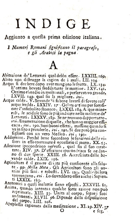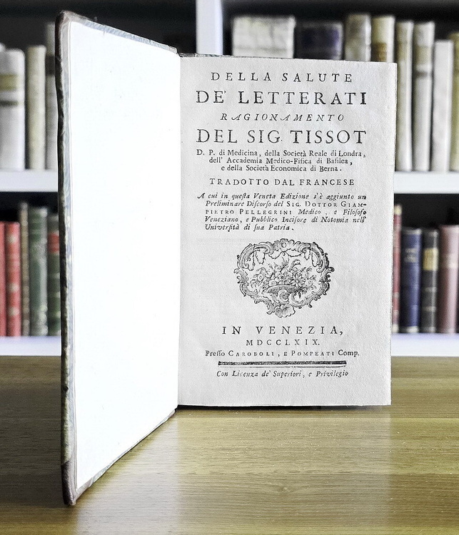 Cm. 16, pp. L (6), 204 (16). Bella legatura strettamente coeva in mezza pelle con punte; dorso lisco con titoli su tassello, filetti e fregi in oro. Carta decorata veneziana ai piatti e segnacolo in seta verde ben preservato. Antica nota manoscritta di possesso di mano coeva alla sguardia iniziale. Lieve alone al margine superiore delle carte non numerate finali. Esemplare nel complesso ben conservato. Simon André Tissot (1728-1797), celebre medico svizzero, fu professore a Losanna e Pavia. Questo curioso saggio è dedicato alla conservazione della buona salute di letterati, giureconsulti ed intellettuali caratterizzati da una vita sedentaria. Interessanti i numerosi capitoli dedicati ad alimentazione (caffè, cioccolata, carne, frutta, latte, pane, pesce ecc.), vizi (tabacco e vino), rimedi correttivi (ginnastica, cura del sonno, diversi suggerimenti comportamentali) e patologie della sedentarietà. Non comune seconda edizione italiana arricchita di un Discorso preliminare del traduttore Giampietro Pellegrini, medico e professore di Anatomia presso l'Università di Venezia. Cfr. Iccu.