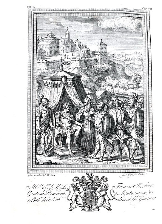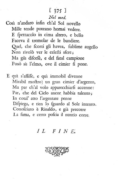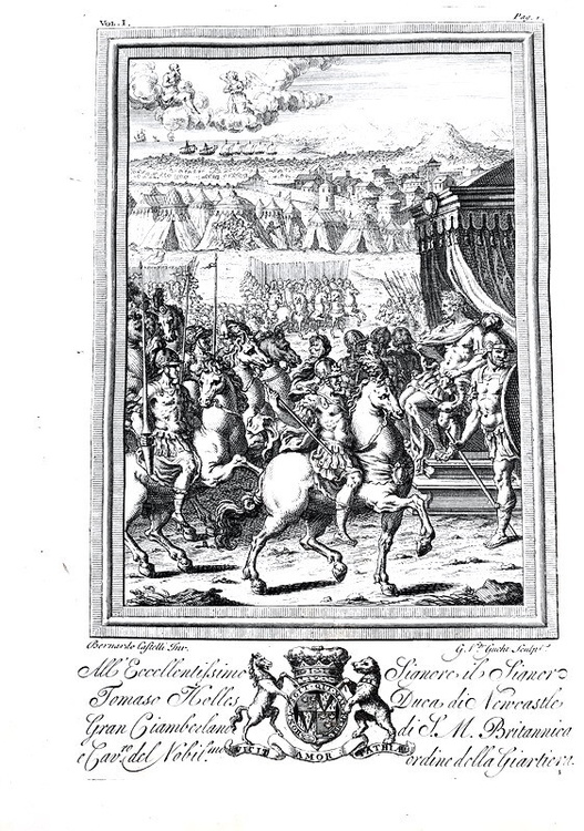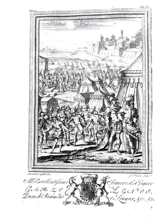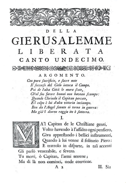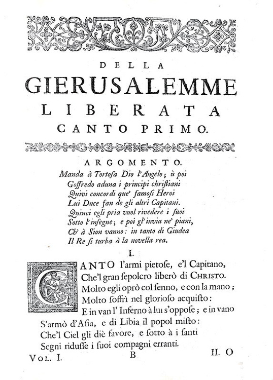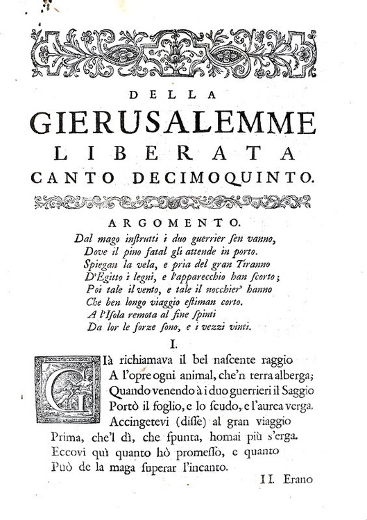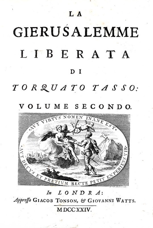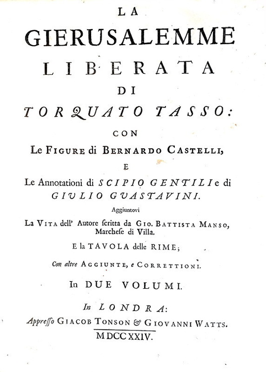 La Gerusalemme liberata con le figure di Bernardo Castelli, e le annotazioni di Scipio Gentili e di Giulio Guastavini. Aggiuntovi la vita dell' Autore scritta da Gio. Battista Manso, marchese di Villa. e la Tavola delle rime, con altre aggiunte, e correzioni. In due volumi. In Londra, appresso Giacob Tonson & Giovanni Watts, 1724.