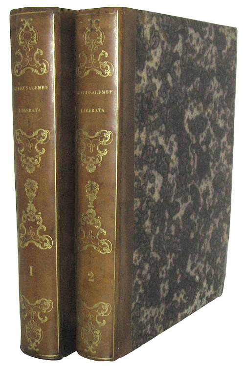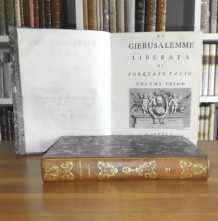 Due volumi di cm. 26,5, pp. (24) 152, (8), 331 (1); 375 (1), 122 (6). Bellissimo ritratto a piena pagina dell'Autore inciso da N. Depuis e 20 magnifiche tavole (poste in apertura di ciascun canto) incise in rame da Van der Gucht su disegni originali di Bernardo Castello. Vignette ai frontespizi, grandi testatine e capilettera incisi in legno e rame. Bella legatura ottocentesca in mezza pelle con titoli e ricchi fregi in oro al dorso; piatti e tagli marmorizzati. Sporadiche e trascurabili arrossature, qualche impercettibile alone limitato a poche carte. Bell'esemplare, di non comune freschezza. Stupenda edizione londinese figurata del capolavoro tassiano. All'inizio dell'opera troviamo un'ampia biografia dell'Autore e in fine (con numerazione autonoma) le annotazioni di Scipione Gentili e di altri letterati del tempo, nonché una copiosa tavola di indici. Cfr. Iccu; Graesse (VII, p. 33): «Belle édition soignée par N. Fr. Haym»; Brunet (V, 666): «Assez belle édition»; Guidi (36/37): «Una delle più vaghe, pregiate e magnifiche edizioni»; Raccolta Tassiana di Bergammo, 252; Gamba, 948n; Cohen De Ricci, 974.