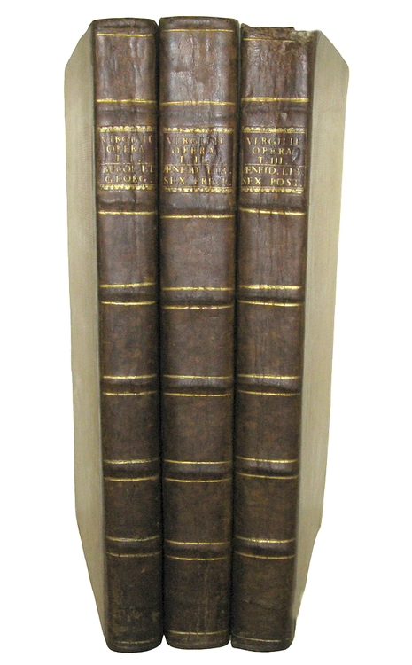 Tre imponenti volumi di cm. 43, pp. (2) xcii, 211 (1); lx, 36; xxiv, 343 (1). Tre bellissime antiporte allegoriche con dediche o ritratti rispettivamente di Carlo Emanuele III (incisore Marco Carloni), Vittorio Amedeo Sabaudiae Dux (incisore Francesco Barbazza) e di Benedetto Maria Maurizio Dux (incisore Ignazio Benedetti). Opera sontuosamente illustrata da incisioni in rame: 2 tavole f.t. (quella al vol. I con i vari "Specimen" dei codici manoscritti da cui la presente edizione venne tratta; quella al vol. II è una carta geografica con particolari dell'Italia e della Grecia) e da circa 140 tra testatine e finalini (di cui alcuni anche a mezza pagina) raffiguranti i passi più significativi delle opere. Elegante legatura coeva in mezza pelle; dorso a 6 nervi con titoli su tassello in marocchino rosso e filetti in oro. Minimi segni del tempo alle legature, piccola menda alla cuffia superiore del terzo volume, macchia al piatto anteriore del terzo volume, punte foderate, qualche sporadico/marginale alone alone, trascurabili fioriture. Nel complesso bell'esemplare, assai marginoso e caratterizzato da carta forte e candida. Magnifica edizione settecentesca dell'Opera omnia latina virgiliana, accompagnata da traduzione e commento in lingua italiana del padre gesuita Antonio Maria Ambrogi (1713-1788), stimato latinista di origini fiorentine. Oltre che per la veste tipografica, l'opera viene elogiata per le varianti e i commenti dell'Ambrogi che dovette collaborare strettamente anche con gli illustratori. "A very sumptuous publication. It was published by Ambrogius from the text of Medicean Ms.; with various readings from a Vatican Ms.; and contains an Italian version, with short notes" (Dibdin, Bibliotheca Spenceriana). Importante e rara edizione, stampata in un limitato numero di esemplari. Cfr. Iccu; Mambelli, Edizioni virgiliane, 417: “Edizione monumentale, divenuta rara”; Graesse, VII, 343; Bunet, V, 1306.
