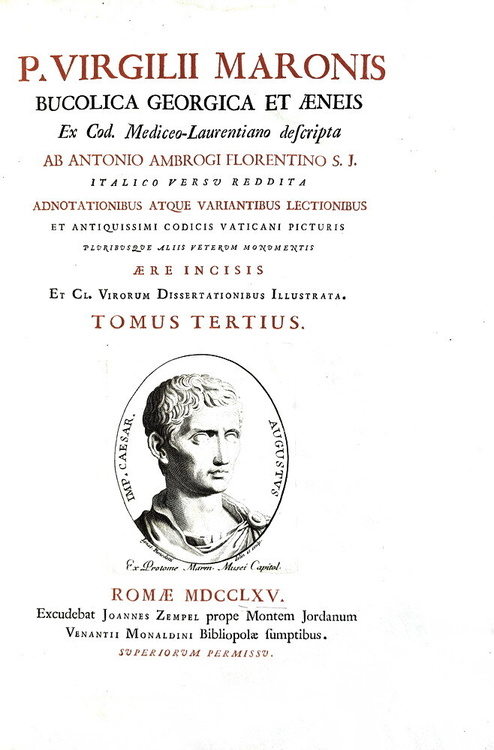 Bucolica Georgica et Aeneis ex cod. Mediceo-Laurentiano descripta ab Antonio Ambrogi florentino S.J italico versu reddita adnotationibus atque variationibus lectionibus et antiquissimi codicis Vaticani picturis pluribusque aliis veterum monumentis aere incisis. Et cl. virorum dissertationibus illustrata. Tomus primus ( - tertius). Romae, excudebat Joannes Zempel, 1763-65.