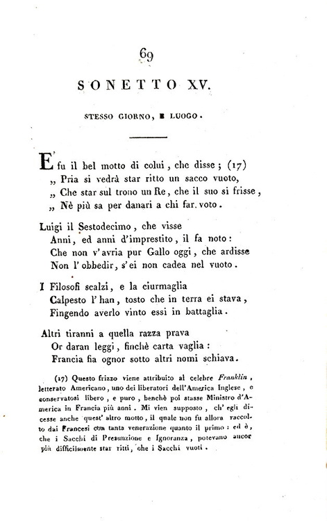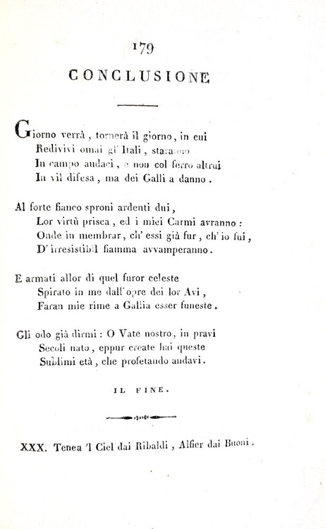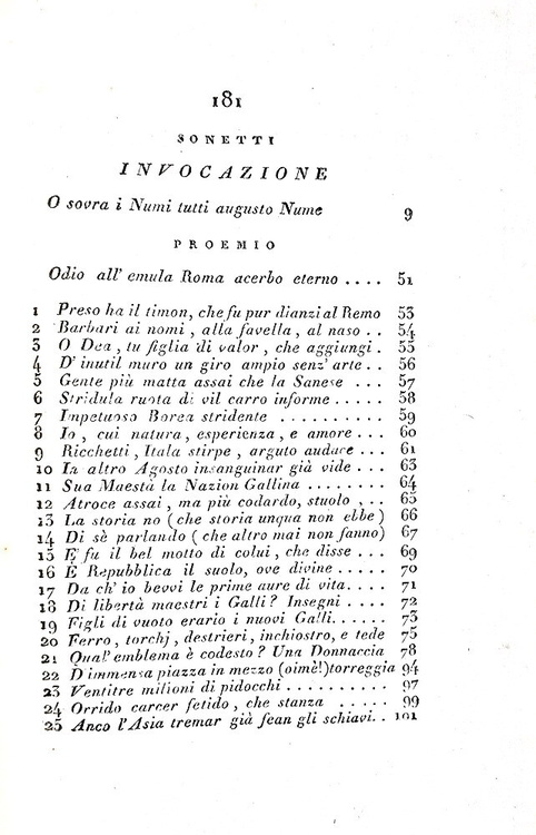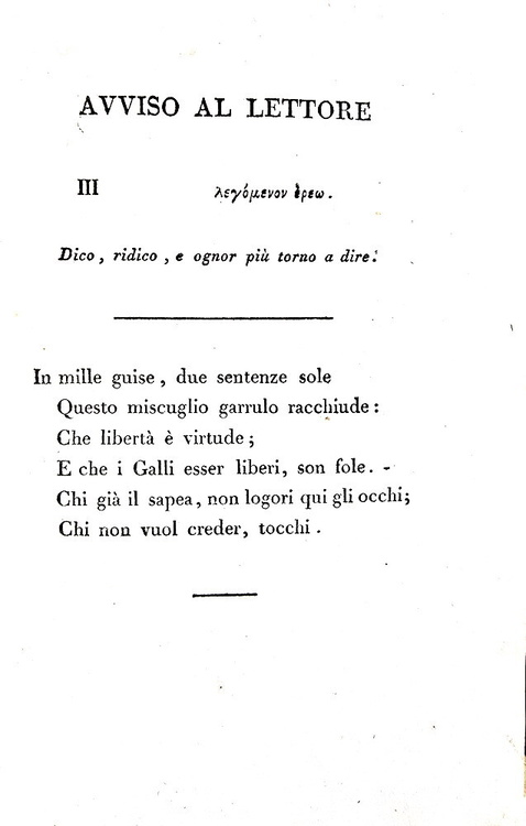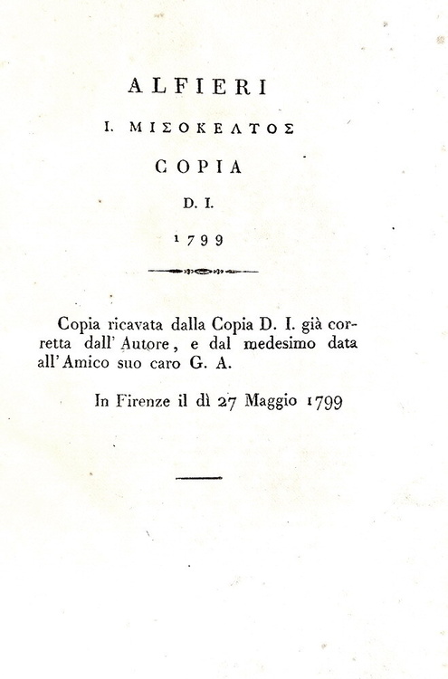 Il Misogallo. Prose e rime di Vittorio Alfieri da Asti. Londra (ma Pisa), s.n. (ma Nistri), 1799. [Edizione pubblicata a Pisa nel 1814 da S. Nistri, cfr. V. Alfieri, in Opere di V. Alfieri da Asti, v. V: Scritti politici e morali, Asti, 1984, III, p. LXXXVI; attribuita Firenze, cfr. Parenti, M. Luoghi di stampa falsi, p. 126].
