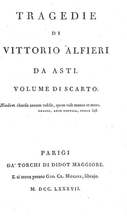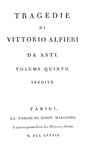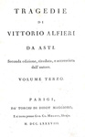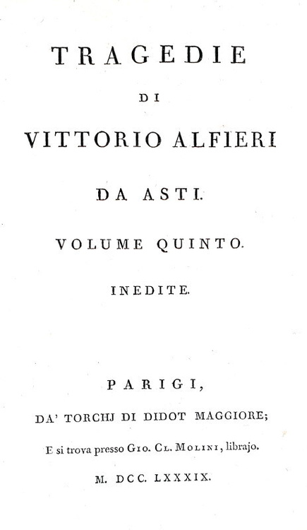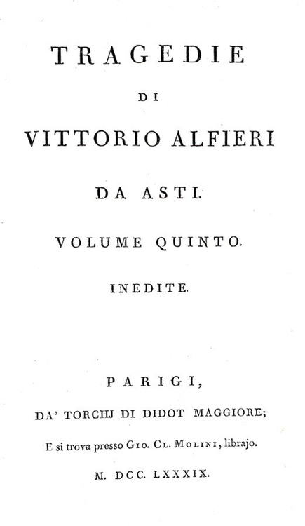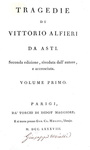 Tragedie. Seconda edizione, riveduta dall'Autore, e accresciuta. Parigi, da torchj di Didot Maggiore e si trova presso Gio. Cl. Molini, librajo, 1787-1789.