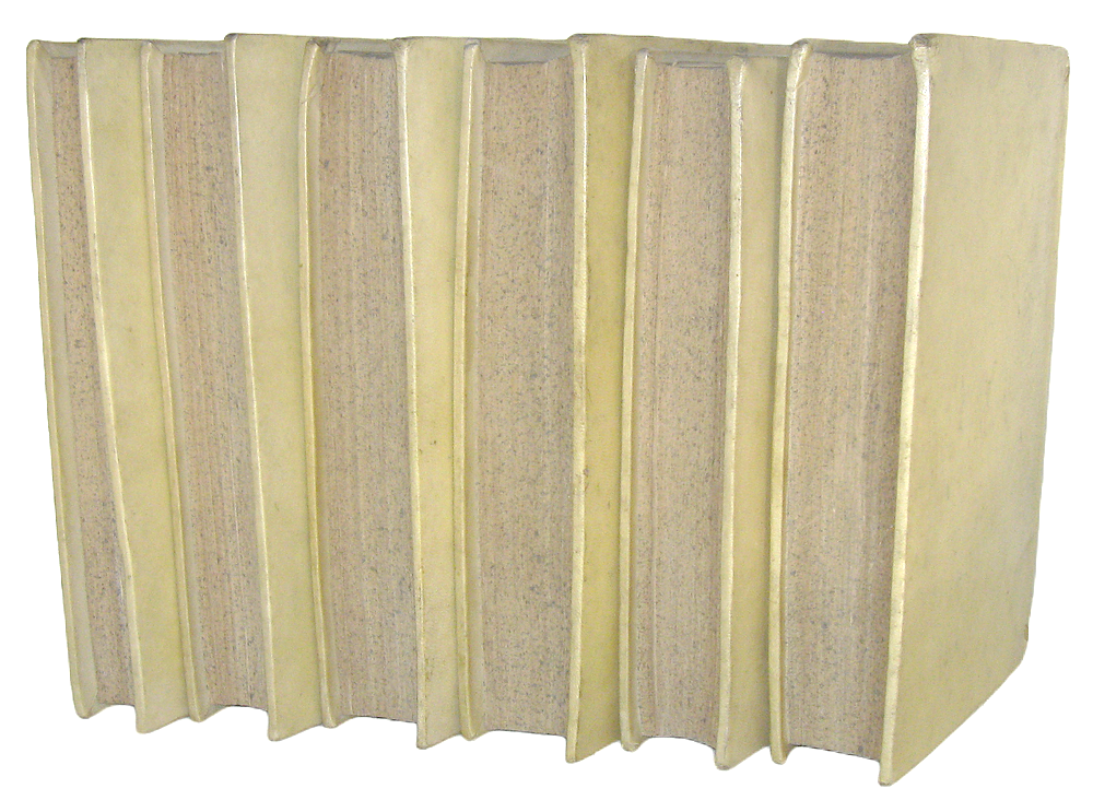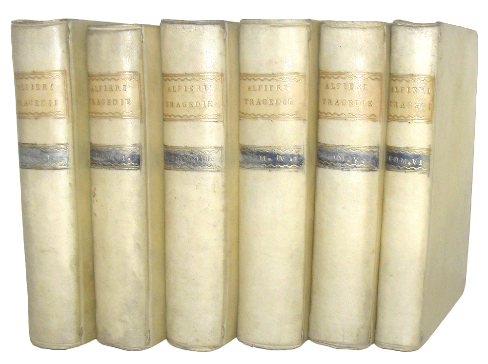 Sei volumi di cm. 21,5, pp. cxx, 279 (19); 383 (3); 419 (1); 441 (1); 425 (3) + 1 c.b.; 272. Con ritratto dell'Autore finemente inciso da Morghen su disegno di Fabre all'antiporta del primo volume (il ritratto è da considerarsi assai raro in quanto assente nella maggior parte degli esemplari, cfr. Bustico, 5). Bella legatura strettamente coeva in piena pergamena rigida con titoli in oro al dorso. Tagli spruzzati. Timbretto di biblioteca privata ottocentesca alla sguardia e firma di possesso al primo frontespizio, entrambi riferiti al livornese Giuseppe Uzielli. Leggere e naturali fioriture/bruniture dovute alla qualità della carta. Esemplare nel complesso fresco e ben conservato. Rara seconda e definitiva edizione in parte originale delle tragedie di Vittorio Alfieri - dopo quella “sudicissimamente stampata” (A., Vita IV, X) a Siena da Pazzini nel 1783 - da tenersi in singolare pregio, essendo stata assistita dall'Autore medesimo (Gamba, 2527). Prima edizione delle seguenti tragedie alfieriane: Maria Stuarda, La congiura de' Pazzi, Don Garzia, Saul, Agide, Sofonisba, Bruto I, Mirra, Bruto II, nonché della "Risposta dell'Autore" alla lettera del Calzabigi, del "Parere dell'autore sull'arte comica in Italia", e del "Parere dell'autore su le presenti tragedie". Esemplare completo del "Volume di scarto", che contiene il testo delle tragedie Filippo, Polinice e Antigone, stampato da Didot nel 1787, in una versione già rivista rispetto all'edizione di Siena, ma che lasciò ancora insoddisfatto l'incontentabile Alfieri, che si decise quindi a procedere a una ulteriore revisione del testo di queste tragedie, e adaffrontare le fatiche e le spese di ulteriore ristampa del primo volume, comparsa nella nuova emissione del volume primo, datata 1788. In questa magnifica edizione parigina, dovuta al principe dei tipografi francesi del tempo, François Ambroise Didot, compaiono per la prima volta alcuni tra i massimi capolavori di Alfieri: Saul, Mirra e i due Bruti. L'Alfieri ne seguì personalmente la stampa per più di due anni, correggendo le bozze, e sollecitando il lavoro dei tipografi, che spesso preferivano dedicarsi alle discussioni politiche, e alle manifestazioni di piazza che animavano i primi turbolenti anni della Rivoluzione Francese. Questa impresa costituì per il poeta astigiano anche un pesante impegno finanziario per sostenere il quale dovette fare ricorso a un prestito della madre. Nel tentativo di evitare il danno economico derivante dalle ristampe non autorizzate (allora non esisteva ancora una effettiva tutela del diritto d'Autore), Alfieri lanciò una sottoscrizione appoggiandosi a vari amici e corrispondenti che aveva nelle principali città italiane e nelle capitali europee, ma il successo non fu quello sperato, tant'é vero che alla sua morte, avvenuta nel 1803, molte delle 625 copie stampate giacevano ancora invendute a Firenze, presso la sua compagna, la Duchessa d'Albany. Il "volume di scarto" è spesso mancante perchè molti acquirenti delle Tragedie non curarono di farlo rilegare, costituendo in buona sostanza un doppione del primo volume, ed esso andò così soggetto a una rapida dispersione. Il ritratto del poeta che si trova inserito in alcuni esemplari, non appartiene a questa edizione (non é infatti neppure citato nella "Regola per i legatori" che compare in fine al volume primo), ma è stato aggiunto in seguito per iniziativa dei proprietari, come dimostra il fatto che si tratta di un ritratto inciso sulla sulla base di un ritratto di Alfieri dipinto dopo il 1793 dal pittore francese Fabre che conobbe il poeta e ne divenne amico (e più ancora amico della Duchessa d'Albany) negli anni del soggiorno fiorentino. Gamba, 2527 :"Tra il novero stragrande di edizioni di queste tragedie, va tenuta la presente in singolare pregio, essendo stata assistita dall'Autore medesimo". Brunet, I, 176 :"Cette belle edition ... n'est pas commune, et elle a été jadis fort recherchée". Poggiali, II, 96 :"La presente edizione é assai pregevole sia per la sua particolare bellezza, come per essere stata assistita di correzione, e illustrata dell'Autorecon la giunt adi nuove Tragedie, e del di lui parere ... sull'arte difficilissima di scrivere tragedie ..."; Bustico, pagg. 4 - 6 :"Di questa bella edizione parla l'Alfieri stesso nella sua Vita (cap. XVII) e di essa si compiaceva." Fava, Mostra storica Astese - Alfieriana n. 3; Graesse I, 74.