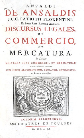 Discursus legales de commercio et mercatura in quibus universa fere commercii er mercaturae materia resolutive continentur. Genevae, apud fratres De Tournes, 1751