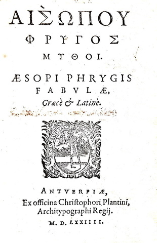 Aisopou Phrygos Mythoi. Aesopi Phrygis fabulae graece & latine. Antuerpiae, ex officina Christophori Plantini, architypographi regij, 1574