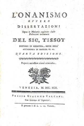 L'onanismo, ovvero dissertazione sopra le malattie cagionate dalle polluzioni volontarie. Venezia, presso Giacomo Carcani, 1792