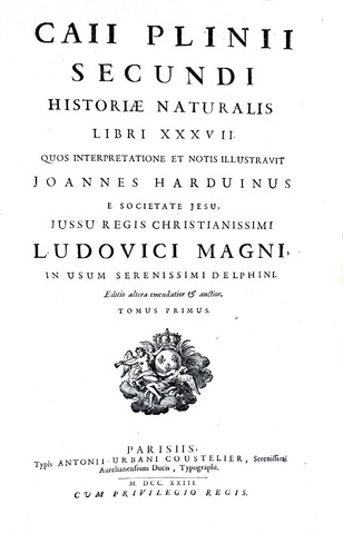 Historiae naturalis libri xxxvii quos interpretatione et notis illustravit Joannes Harduinus e societate jesu, jussu regis christianissimi ludovici magni, in usum serenissimi delphini editio altera emendatior & auctior. Parisiis, typis Antonii-Urbani Coustelier, 1723
